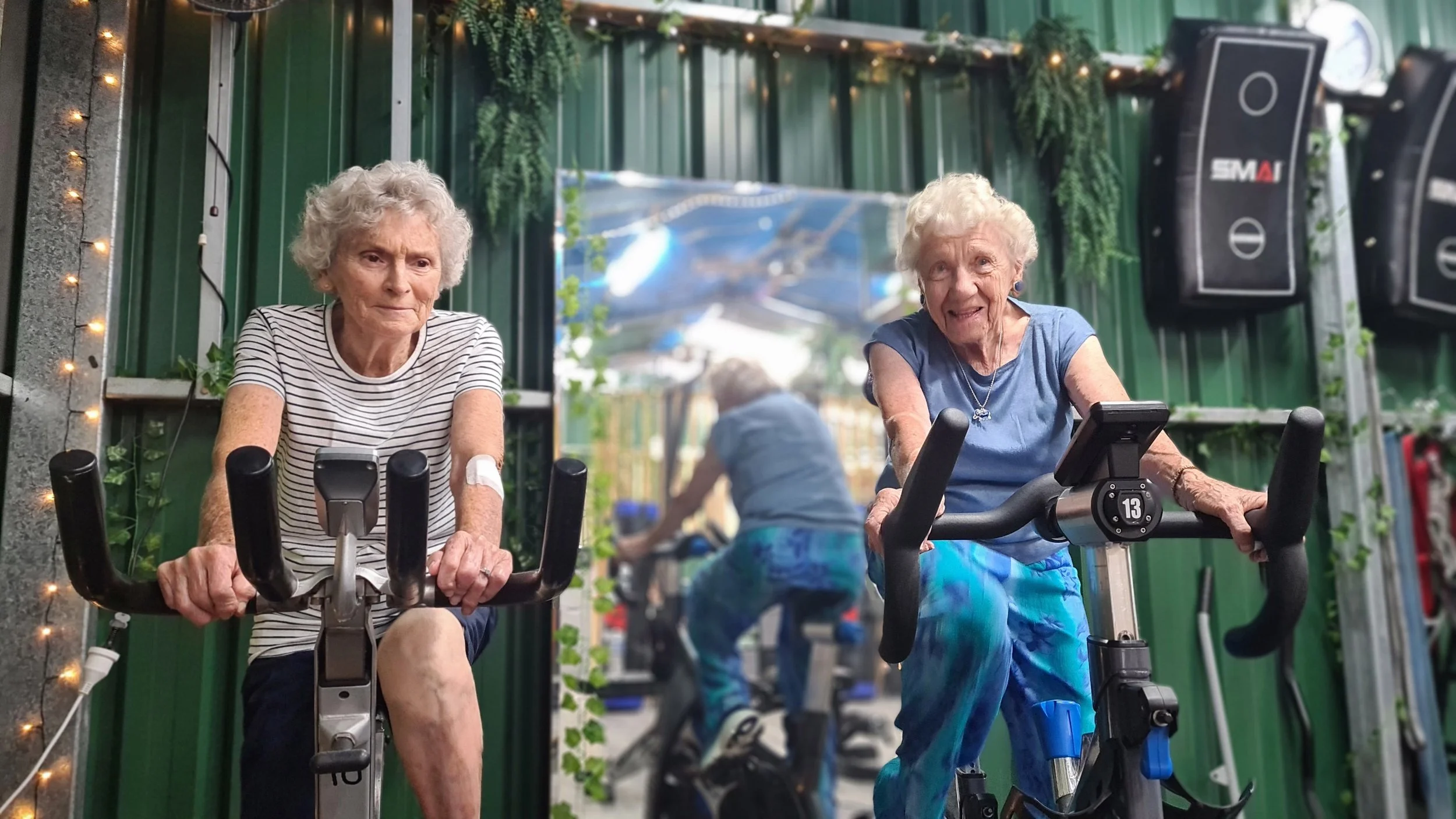 Now in the 2020’s Simon’s mum Viola Cadzow (right), aged 95, with her training partner Val, still maintains a healthy lifestyle with strength training a regular part.